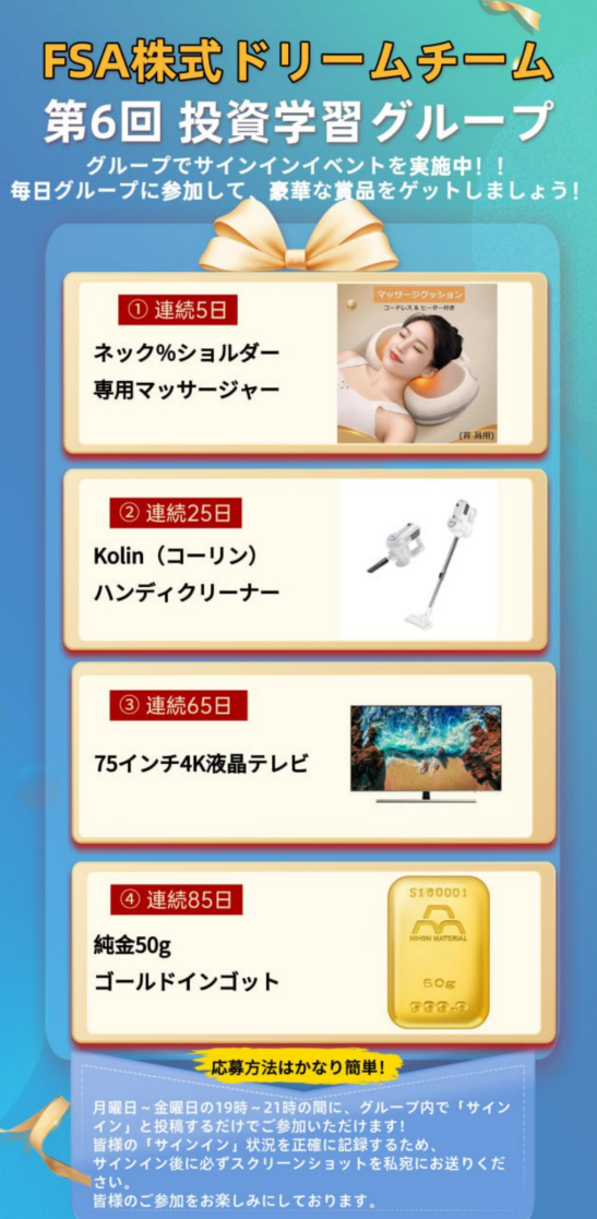 月曜~金曜の19時~21時の間に「投資学習グループ」に「サインイン」と送信するだけで、豪華賞品を贈呈します。